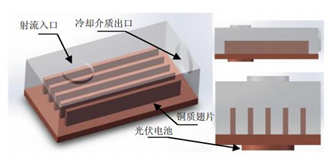 A water-cooled heat exchanger with fins is designed in this article, as shown in Figure 9. Under the conditions of a concentrating multiple of 400X and a limiting temperature of 50°C of the cooling medium, the cell surface temperature was controlled at 59.73°C combined with jet impact technology, which met the requirements for photovoltaic cells working below 60°C. The heat exchanger was tested and numerically simulated and the results showed that the highest surface heat transfer coefficient of the heat exchanger was 9688W/(m2.K). The average surface heat transfer coefficient was 5075 W/(m2.K). A mass flow rate of 0.1 kg/s was determined as the optimal operating flow rate through studying the relationship between the flow rate and heat transfer of jet flow heat exchangers.